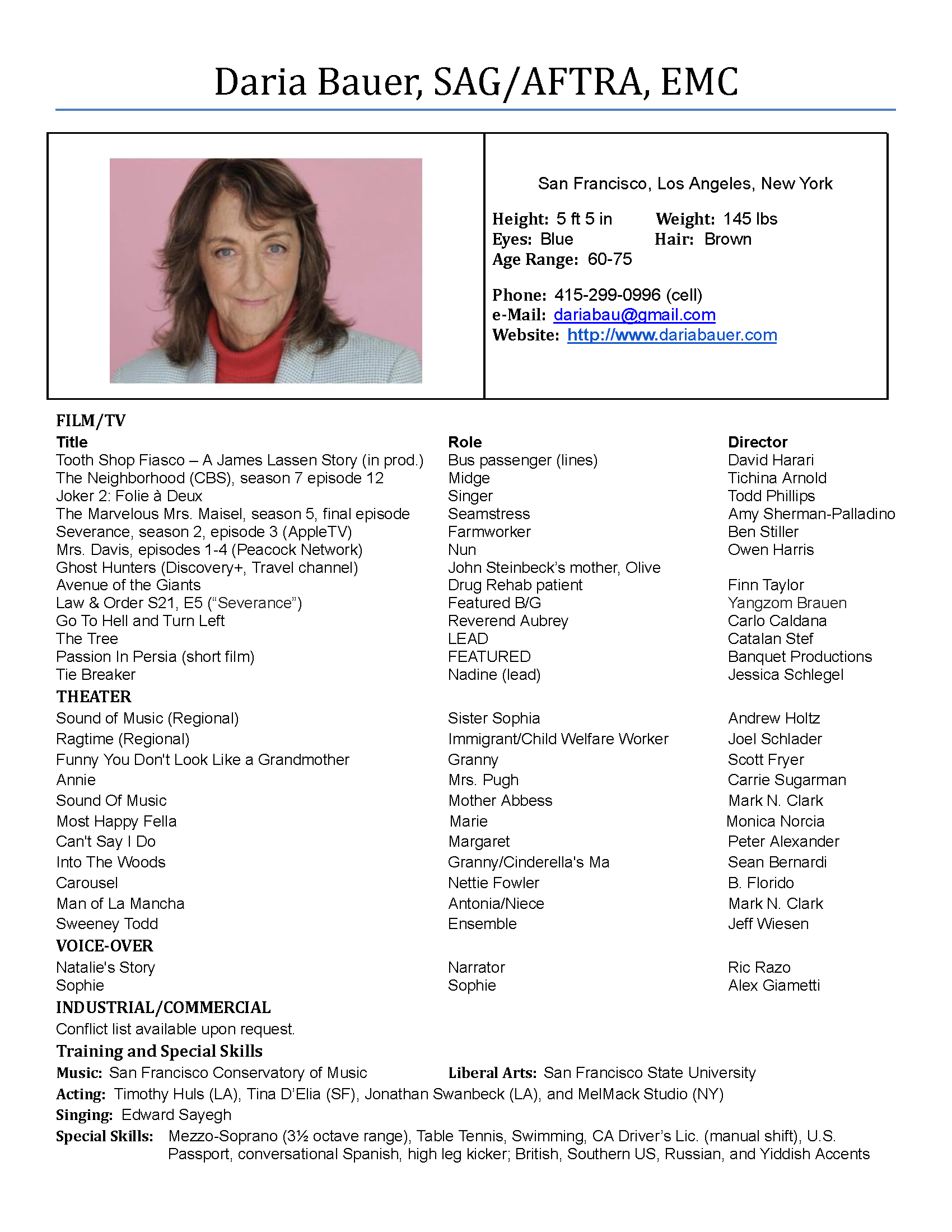 I first saw Daria Bauer in a production of “The Most Happy Fella” for the Novato Theatre Co. She was playing the role of Tony’s sister, and she seemed very solid vocally and in her character interpretation. She was part of the ensemble when I acted as Musical Director for “Once Upon a Mattress” for the Ross Valley Players and she was again solid on stage; both vocally and dramatically. When I sang the role of Mrs. Peachum in a recent production of “Three Penny Opera” at the College of Marin, Daria was again in the ensemble and she enthusiastically threw herself into her time on stage.